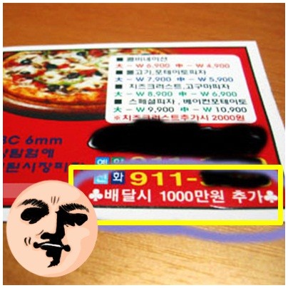 사진에는 일반 피자집 전단지를 찍은 사진으로 특히 오른쪽 하단에 ‘배달시 1000만원 추가’ 라고 적혀 있어 보는 이들의 폭소를 유발하고 있다.