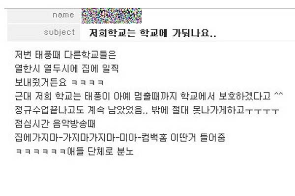 "저번 태풍 때 다른 학교는 오전 11시나 12시에 보내줬는데 우리 학교는 정규수업을 모두 마친 뒤에도 학생들을 가둬놨다. 학생들을 태풍으로부터 보호하겠다고. 밖에 못나가게 하고…. 점심시간 음악방송 때는 미아의 '집에 가지마', '컴백홈' 이런 음악까지 틀더라. 우리들 단체로 분노 폭발"