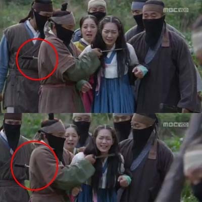 MBC 아랑사또전에서 복면을 한 채 신민아를 끌고 가는 남성의 등에 칼이 꽃혀 있다. 그것도 거의 칼 손잡이 부분까지 꽃힌 상태다.