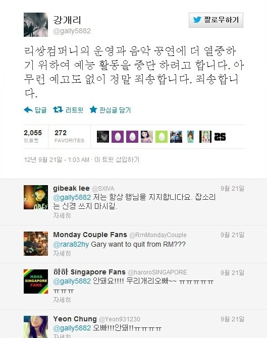 개리는 21일 오후 자신의 트위터에 "리쌍컴퍼니의 운영과 음악 공연에 더 열중하기 위하여 예능 활동을 중단 하려고 합니다. 아무런 예고도 없이 정말 죄송합니다. 죄송합니다"라는 글을 게재해 하차에 대한 확고한 의지를 드러냈다.