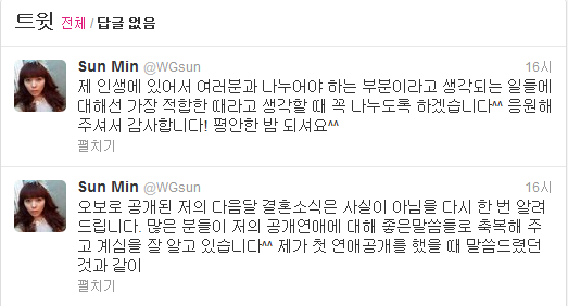 원더걸스 선예가 자신의 결혼설에 대해 "오보로 공개된 저의 다음달 결혼소식은 사실이 아님을 다시 한 번 알려드립니다"라고 썼다. 22일 자신의 트위터를 통해서다.