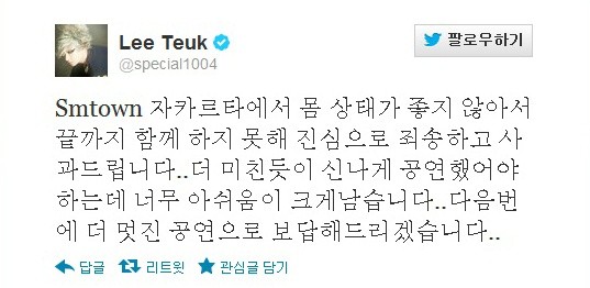 이특은 23일 자신의 트위터에 "SM타운 공연 당시 몸 상태가 좋지 않아 끝까지 참여하지 못했다"며 팬들에게 사과의 뜻을 전했다.