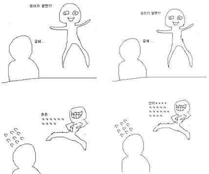 이 캐릭터가 선보이는 ‘하면 혼나는 개그’는 “샤이니가 사는 동네는?”-“링딩동”, “오리가 얼면?”-“언덕”, “모래가 울면?”-“흙흙” 등. 문제는 낸 캐릭터는 답을 말하며 홀로 폭소를 터뜨리고 있어 눈길을 끈다.
