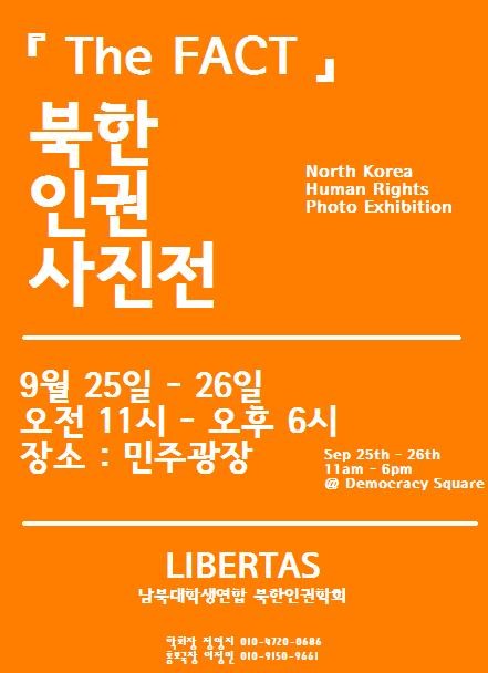고려대학교 남북대학생연합 북한인권학회인 'LIBERTAS(리베르타스)'는 오는 25일과 26일 오전 11시에서 오후 6시까지 고려대학교 민주광장에서 북한인권 사진전 'The Fact'를 개최한다.