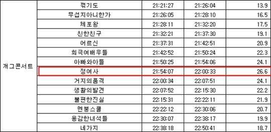 24일 시청률 조사회사 AGB닐슨미디어리서치에 따르면 23일 방송된 '개콘' 코너별 시청률 1위는 26.6%를 기록한 '정여사'(오후 9시 45분~10시)로 밝혀졌다.