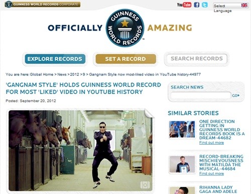 싸이의 '강남스타일' 뮤직비디오는 공개 19일째(8월 2일) 1,000만, 41일째(8월 24일) 5,000만, 52일째(9월 4일) 1억, 60일째(9월 12일) 1억 5,000만 조회를 넘겼다.