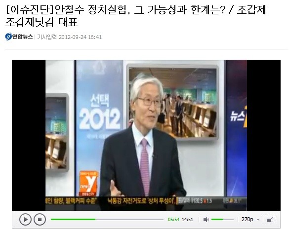 조갑제 대표: 그렇다. 기성 정치를 부정하고 나왔다. 그리고 이 분에 대해 잘 이해되지 않는 부분이 있다. 정치를 비판한다. 특히, 이런 국회를 가지고는 안 된다고 비판한다. 그렇다면 왜 국회의원 선거 때 왜 놀고 있었는가? 왜 투표 90일 전에 나와서 이런 소란을 부리는가. 정치개혁에서 가장 중요한 것은 정당정치를 확립하는 것이다. 우리 나름대로 정치는 성공했다. 정치가 실패했다는 말에 동의하지 않는다. 대한민국의 이러한 발전은 정치의 뒷받침이 있었기 때문에 가능했다. 정당정치를 미국식으로 뿌리내려야 한다. 그런데 안철수 씨의 등장은 그나마 뿌리내리는 정당정치의 근간을 뒤흔들고 있다. 이것은 舊習(구습)이다. 옛날 정치식, 원시시대 식으로 돌아가자는 정치를 하자는 것이다.
