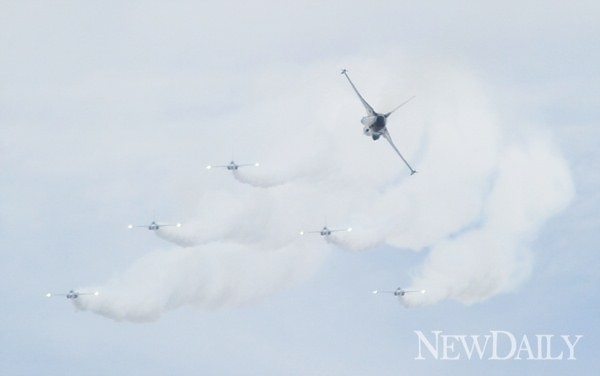26일 오전 충남 계룡대에서 건군 제64주년 국군의 날을 기념하는 행사가 열렸다. 식후 행사 일부로 국군의 힘찬 비상을 표현 한 블랙이글의 축하비행이 진행됐다.