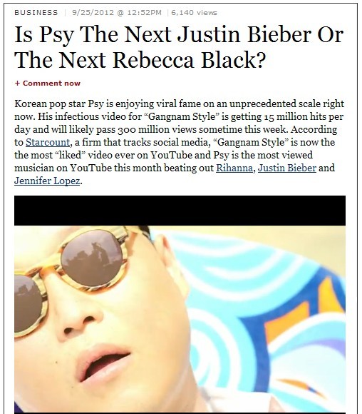 포브스는 지난 25일 홈페이지를 통해 '싸이가 제2의 저스틴 비버가 될까, 레베카 블랙이 될까?(Is Psy The Next Justin Bieber Or The Next Rebecca Black?)'라는 제목의 기사를 게재했다.