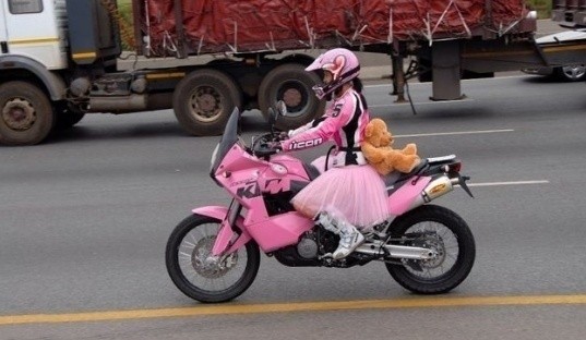 눈길을 끄는 건 이 여성이 핑크색 오토바이에 핑크색 헬멧, 핑크색 상의와 치마까지 입고 있다는 것이다.