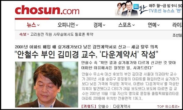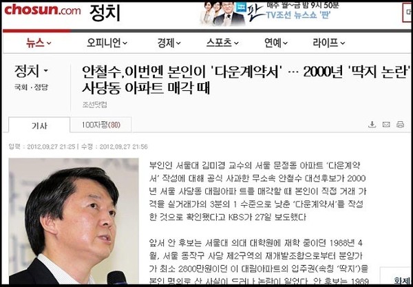 조선닷컴은 “앞서 안 후보는 서울대 의대 대학원에 재학 중이던 1988년 4월, 서울 동작구 사당 제2구역의 재개발조합으로부터 분양가가 최소 2800만원이던 이 대림아파트의 입주권(속칭 ‘딱지’)을 본인 명의로 산 사실이 드러나 논란이 일었다. 안 후보는 1989년 12월 이 아파트에 입주해 1993년까지 4년간 거주했으며 2000년 10월 이 아파트를 팔았다”며 “김 교수는 2001년 11월 문정동의 올림픽훼밀리타운 아파트(163㎡·49평)를 2억5000만원에 샀다는 내용이 기재된 거래 계약서를 관할 구청에 신고했지만 부동산업계에 따르면 김 교수가 아파트를 매입한 당시 같은 평수의 올림픽훼밀리타운 아파트 거래가는 2억5000만원의 2배 정도인 4억7000만원 선이었다”고 보도했다. 최상위층 부르좌인데 하층 흉내를 내려고 하니. 안철수 후보는 주장과 실제가 서로 어긋나는 구조적인 기만과 정치적인 자충수가 따르는 듯하다.