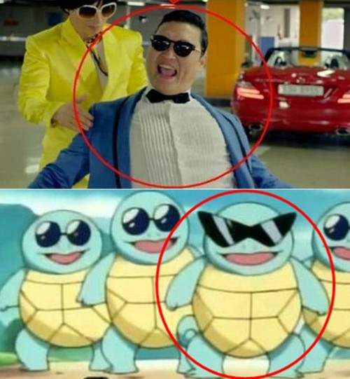 사진에는 선글라스를 쓰고 배를 내밀고 있는 싸이의 모습과 포켓몬스터에서 선글라스를 쓰고 있는 꼬부기의 모습이 담겼다.