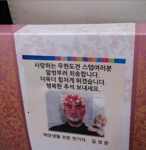 "사랑하는 '무한도전' 스태프 여러분, 말썽부려 죄송합니다. 더욱더 힘차게 뛰겠습니다. 행복한 추석 보내세요. 해양생물 전문 연기자 길성준."