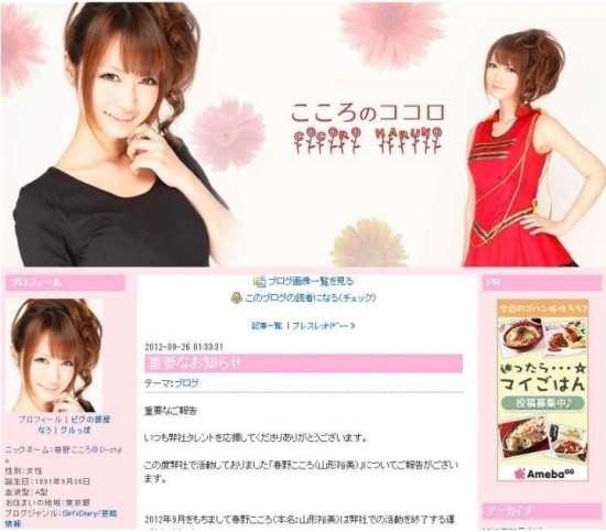 일본 걸그룹 멤버인 하루노 코코로가 성매매업소에 근무한 사실이 드러나 소속사로부터 해고 통보를 받았다.