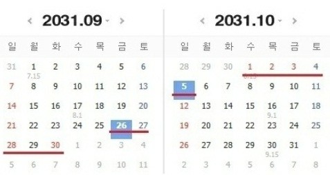 이 달력을 보면 2031년 9월 29일 하루 월차를 쓰면 9월 26일부터 10월 5일까지 10일간의 황금연휴를 보내게 된다.