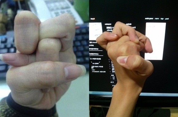 사진 속 손가락은 한 손으로 만들어냈다고 믿을 수 없을 정도로 기묘한 모습을 하고 있다. 다섯 손가락을 각기 다른 방향으로 굽혀서 고정하고 있는 것.