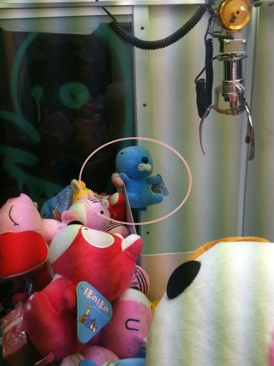 공개된 사진에는 ‘인형뽑기’ 기계 속에 들어있는 보노보노 인형의 모습이 찍혀있다. 누군가가 건져 올리다 실패한 것으로 보이는 보노보노는 배출구 턱에 대롱대롱 매달려 있다.