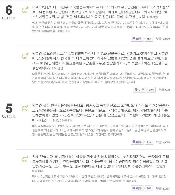 "나름 국위선양한답시고 더이상 일이 불거지지않게 조용히 해주마라고. 내가정리하고 이번 앨범 활동만 마치면 바로 떠날테니 걱정말고 다시 돌아갈 길은 없다고 했는데 이게 뭡니까..왜 자꾸 사람 몰아갑니까. 어디까지 사람을 바닥으로 몰고 가야 합니까. 이게 언론플레이입니까? 이래서 (제가)돌아갈 수 없는 이유입니다."