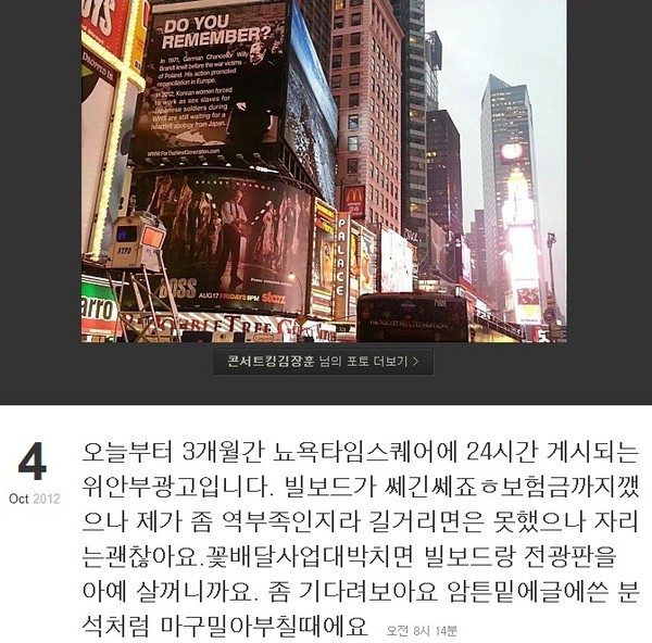 실제로 싸이의 시청 공연이 있던 10월 4일 김장훈은 자신의 미투데이에 "오늘부터 3개월간 뉴욕 타임스퀘어에 24시간 게시되는 위안부 광고입니다. 보험금까지 깼으나 제가 좀 역부족인지라 길거리면은 못했으나 자리는 괜찮아요. 꽃배달 사업 대박 치면 빌보드랑 전광판을 아예 살 거니까요. 좀 기다려보아요"라는 글을 게재했다.