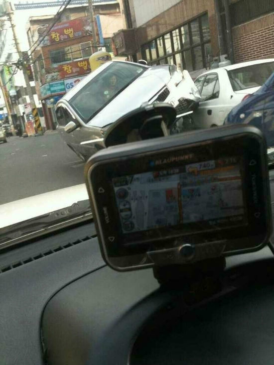 마치 영화의 한 장면을 보는 듯 했다. 한 여성이 타고 있는 차량이 골목을 지나면서 주차된 차량의 옆면을 완전히 덮쳐 버린 것.