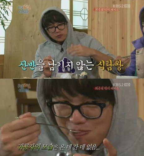상 위에 차려진 전어구이와 한정식을 전부 먹어 치우던 성시경은 다른 멤버들이 배가 불러 더 이상 음식을 먹기 못하는 상황에서도 왕성한 식욕을 뽐내며 잔반을 말끔히 해결하는 모습을 보였다.