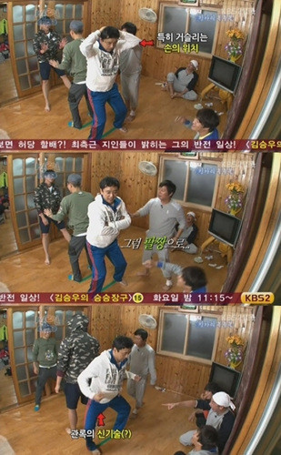 이에 멤버들은 "제발 손을 머리에 얹지 말아달라"며 애원했고, 김승우는 "그럼 손을 어디에 놓냐, 차라리 팔짱을 껴야겠다"며 팔짱을 껴 마치 브라운아이드걸스의 '아브라 카타브라'를 연상케하는 포즈를 취해 다시 한 번 큰 웃음을 선사했다.