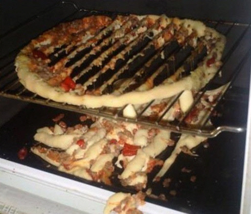 그만 오븐에 피자를 넣을 때 팬을 함께 넣어야 한다는 사실을 잊어버린 것으로 보인다.