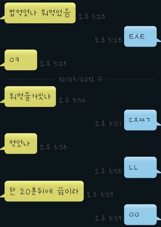 ‘밥 먹었나, 뭐 먹었음’이라고 시작한 인사에는 ‘ㅌㅅㅌ’라고 답변했다. 이어 ‘ㅇㅋ’라고 답한 후 ‘뭐 먹을 거 있나’하고 질문했다. 그러자 ‘ㄷㅈㅉㄱ’라고 답했고, 다시 ‘먹었나’라고 추가 질문했다.