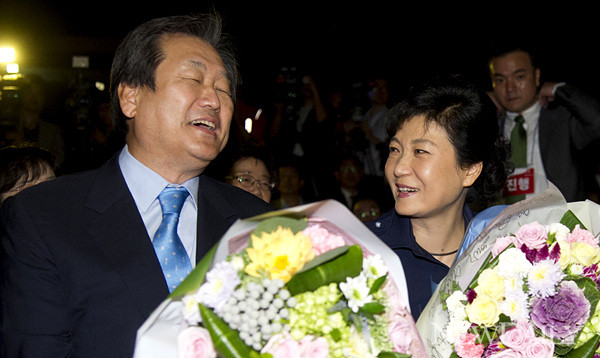 11일 오후 서울 영등포구 당산동의 한 컨벤션 센터에서 열린 새누리당 선거대책위원회 중앙위 워크숍 및 임명장 수여식에서 박근혜 후보, 김무성 총괄선대본부장 이야기를 나누고 있다.
