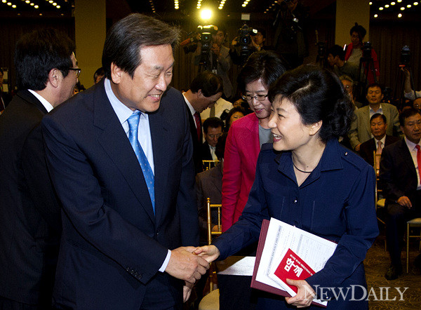 11일 오후 서울 영등포구 당산동의 한 컨벤션 센터에서 열린 새누리당 선거대책위원회 중앙위 워크숍 및 임명장 수여식에서 박근혜 후보와 김무성 총괄선대본부장이 악수를 나누고 있다.