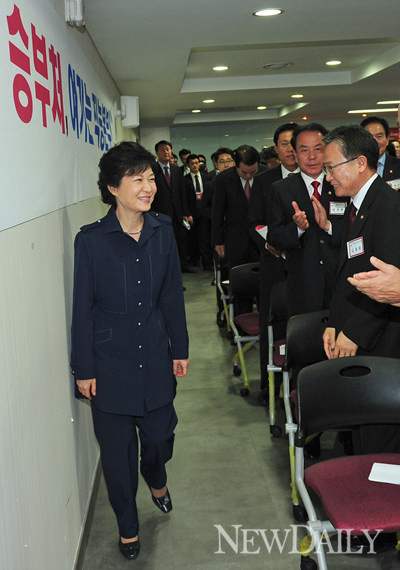 박근혜 새누리당 대통령후보가 11일 서울 여의도 당사에서 열린 '중앙선대위 직능총괄본부' 발대식에 참여했다.