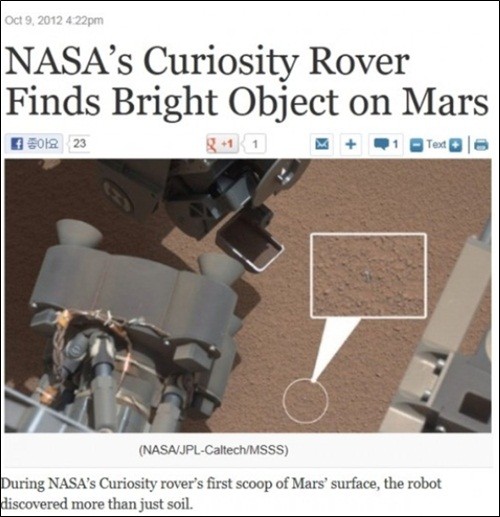 하지만 바로 다음날 외신은 “화성 쇳조각 발견은 큐리오시티에서 떨어져 나온 플라스틱 조각으로 확인됐다”고 전했다.