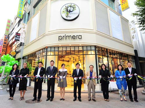 12일 문을 연 프리메라는 아기들도 쓸 수 있을 만큼 순하고 부드러운 화장품이라고 알음알음 좋은 평판이 난 브랜드. 가격대가 조금 높지만, 로드숍에 만족하지 못하는 젊은 여성들도 찾는다.