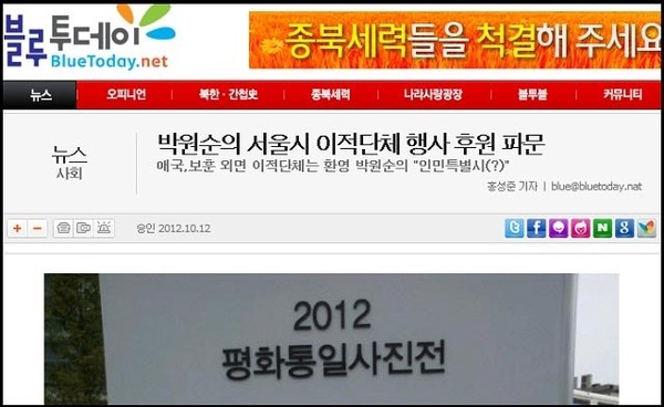 블루투데이는 “서울시가(시장 박원순) ‘2012 평화통일 사진전 그날’에 이적단체 조국통일범민족연합 남측본부(범민련 남측본부)가 포함되어 있어 파문이 일고 있다”며 “대한민국의 수도 서울이 국민세금으로 이적단체를 지원하고 있는 것으로 문제의 심각성이 있다”고 지적했다. 박원순 시장의 종북좌익성은 민주화 추세에 편승하여 노골적으로 표출되고 있어, 우익애국진영의 주목을 점점 더 받고 있다.대한민국과 공존할 수 없는 박원순 서울시장이 대한민국과 사생결단의 대결을 벌일 날이 닥칠 것 같다.