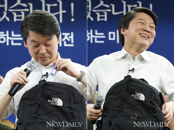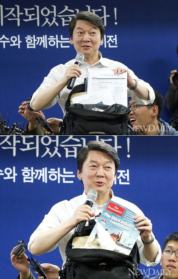 본격적인 행사에 앞서 마련된 `100초 인터뷰'에서는 안 후보가 항상 메고 다니는 배낭에 관심이 집중됐다. 사회자가 "가방 안에 무엇이 들어있냐"고 묻자, 안 후보는 직접 가방을 열어 안에 있는 신문ㆍ외국잡지ㆍ수첩 등을 꺼내서 보여주기 시작했다.