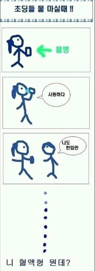 웹툰 형식으로 표현된 이 게시물은 혈액형이 무엇이든 상관이 없지만 어릴 때는 혹시나 하는 마음에 혈액형을 물어보고 같으면 마시고 같지 않으면 마시지 않았던 기억을 상기시킨다.