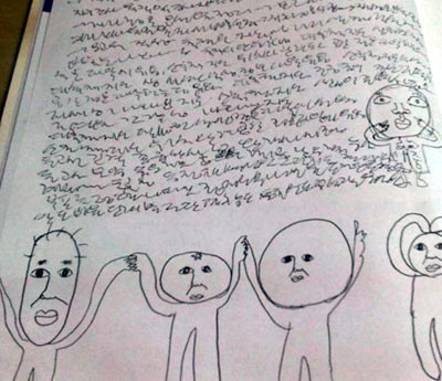 사진 속에는 기괴한 그림과 함께 지렁이가 기어간 듯한 글씨가 A4용지에 빽빽하게 적혀 있다.