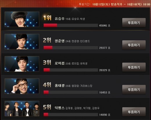 특히 2위인 정준영과 1만여 표가 넘는 큰 차이를 보이며 유승우의 인기를 실감케 하고 있다. 하지만 마감까지 아직 4일이란 기간이 남았기에 앞으로 순위의 많은 변동이 있을 것으로 예상된다.