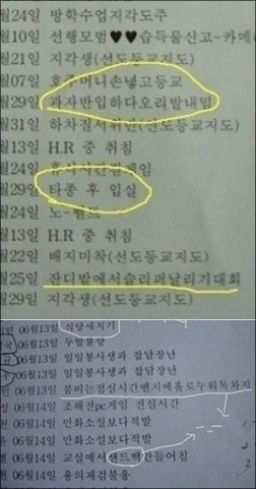 호주머니에 손 넣고 등교, 과자 반입하다 오리발, 잔디밭에서 슬리퍼 날리기 대회 등의 항목으로 벌점을 받았다.