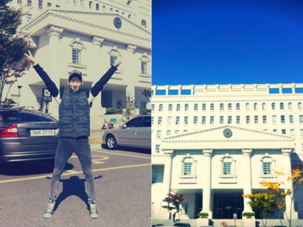 공개된 사진 속 조권은 학교 내 건물 앞에서 양 팔을 뻗은채로 브이(V)자를 그리며 장난스러운 포즈로 서있다.