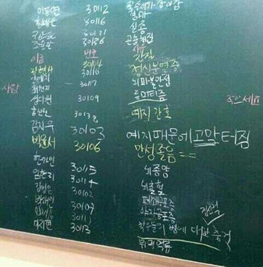 게시물은 여고생들의 조퇴 이유를 빼곡히 적은 칠판을 카메라로 촬영한 사진이다.