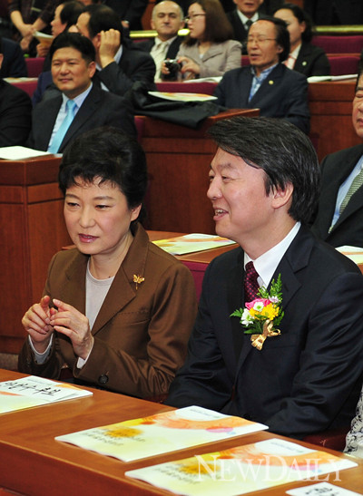 새누리당 박근혜 후보와 무소속 안철수 후보가 17일 오전 국회 헌정기념관에서 열린 '김대중 대통령 기념사업회 토론회'에 참석했다.