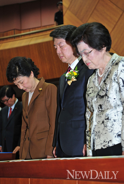 새누리당 박근혜 후보와 무소속 안철수 후보가 17일 오전 국회 헌정기념관에서 열린 '김대중 대통령 기념사업회 토론회'에 참석했다.