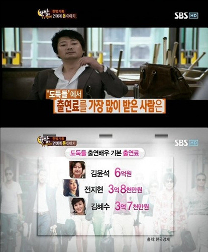 이어 일부 배우들의 출연료도 공개됐는데, '도둑들' 내에서 최고의 출연료를 받은 배우는 바로 김윤석이었다. 그는 총 6억원을 받았으며, 배우 전지현은 3억 8,000만원, 김혜수는 3억 7,000만원, 그리고 막내인 김수현의 경우에는 8,000만원을 받은 것으로 드러났다.