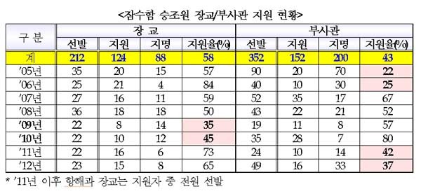 김 의원에 따르면 잠수함 근무 장교는 2009년과 2010년, 부사관은 최근 2년 연속 지원율이 40% 안팎에 그쳤다고 한다. 때문에 해군이 잠수함 인력 운용에 항상 제한을 받으며, 부족 인원은 강제 ‘지명’ 발령해 채우고 있다고 한다.