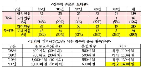 열악한 근무 특성 탓에 이미 잠수함 승조원으로 뽑아놓은 장교의 도태율은 12%, 부사관은 36%에 달하는 것도 문제라고 지적했다.