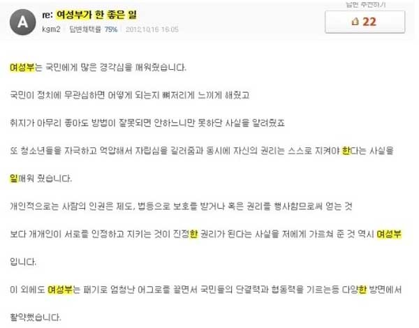 대신 여성부에 대한 비난과 지탄으로 채워졌다. 어떤 네티즌은 "대선후보가 여성부 폐지 약속하면 바로 찍어준다"는 답변도 있었다. 그 중 가장 많은 추천을 받은 답변은 사진과 같았다.