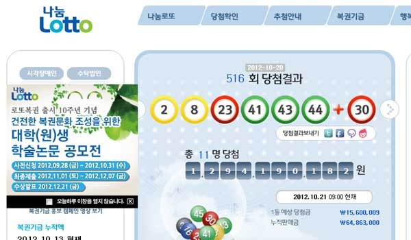 지난 515회 로또 당첨자가 혼자서 100억 원이 넘는 당첨금을 받은 것에 반해 516회 1등 당첨자는 11명이었다.
