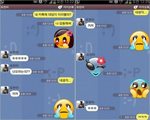 준수와 유천이 카카오톡으로 대화를 나눈 내용을 보면 “내 카카오톡에 대답이 이리 빨라?” “나 감동했어”라고 준수가 재미있는 아모티콘과 함께 메시지를 보내고 있다.