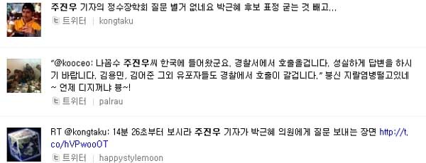 주 기자는 21일 정수장학회와 관련한 박근혜 후보의 기자회견에서 질문을 던지기도 했다.